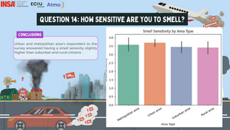 Restitution des travaux (11/04/2025) : durant toute la semaine à l'INSA Rouen Normandie, les étudiants ont travaillé par groupe pour proposer des supports d'information et de sensibilisation sur la qualité de l'air et les odeurs à destination des différentes cibles. Parallèlement, les étudiants ont aussi produit un questionnaire pour une enquête notamment auprès des étudiants de leurs universités. L'objectif était de connaître leurs perceptions sur la qualité de l'air et les odeurs (santé, information, règlementation...). Au total, 200 personnes ont participé à cette enquête.